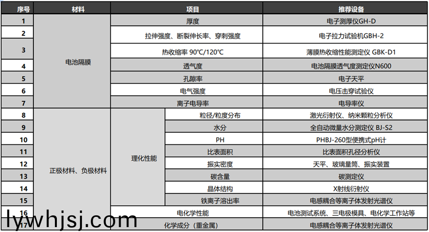 相關(guān)的檢測標(biāo)(biao)準(zhǔn)(zhun)有GB/T 36363-2018 鋰離子電池用聚烯烴隔膜、DB44T 1152-2013 鋰離子電池聚乙烯(xi)隔膜等,對電池隔膜的(de)性能(neng)要求進(jìn)行了明(ming)確的槼定(ding),重點(diǎn)關(guān)註的項目有厚度、拉伸穿刺等力學(xué)性能,薄膜收縮(suo)率、透氣性、孔隙率、水(shui)分(fen)等,相關(guān)項(xiang)目滙總(包含正負(fù)極材料(liao))見下圖: