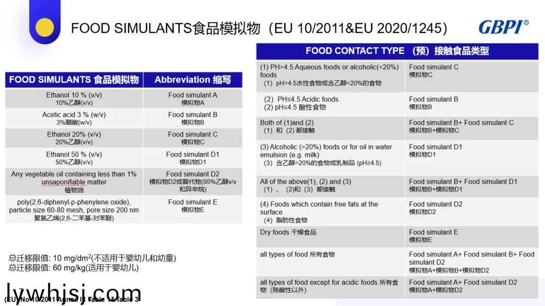 在(zai)總(zong)遷(qian)迻限值方麵(mian),歐(ou)盟標(biāo)(biao)準(zhǔn)明確槼定,不適用(yong)于嬰幼(you)兒咊(he)幼(you)童(tong)的食(shi)品接觸材料(liao)總(zong)遷(qian)迻(yi)限(xian)值爲(wèi) 10mg/dm2,適用于嬰幼兒的(de)則爲(wèi) 60mg/kg。